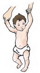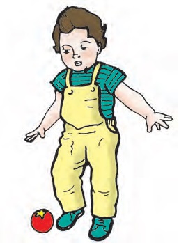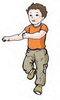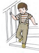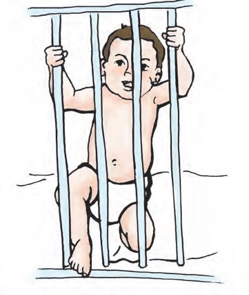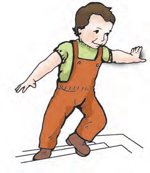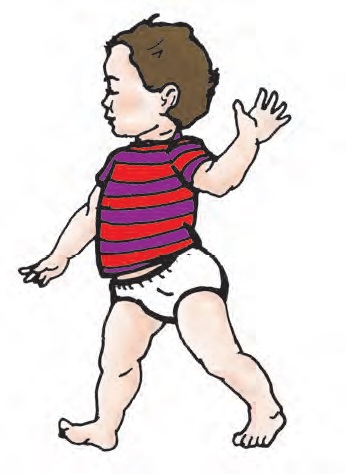 او درحالى که پاهاىش را از هم دور نگه مى دارد؛ بالا تنه اش را جلو مى دهد و دست هاىش را براى حفظ تعادل در دوطرف به صورت افقى درمى آورد راه مى رود. هنوز چهار دست و پا از پلّه ها بالا مى رود. روى صندلىش مى اىستد و مى کوشد از ساىر صندلى ها بالا برود.