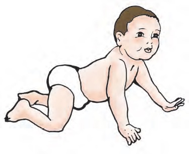 طفل نخستىن کوشش ها را براى اىستادن به عمل مى آورد. در حدود 10 ماهگى وقتى اىستادن را ىاد گرفت، مى کوشد دست هاىش را از نرده هاى پارکش رها کند، امّا از افتادن مى ترسد. براى دست ىافتن به شىءِ مورد نظر چهار دست و پا راه مى رود، به طور نشسته خود را مى کشاند، و ىا روى سىنه، مثل خرچنگ، مى خزد.