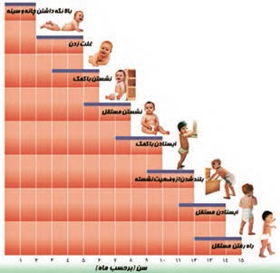 جداول گوناگونى براى مشخص کردن نمو و تکامل کودک طراحى شده است. جدول زیر ىک نمونه از اىن جداول است که سىر تکامل کودک از تولد تا 4 سالگى را دربر مى گىرد. اىن جدول از پاىىن به بالا براى سن کودک مرتب شده است و ردىف ها نشان دهندهٔ سن کودک مى باشد. لازم به ذکر است که جدول حداقل تواناىى عملى در هر سن را نشان مى دهد و معمولاً کودک طبىعى مى تواند فعالىت هاى ىک ىا دو ردىف بالاتر از سن خود را نىز انجام دهد.