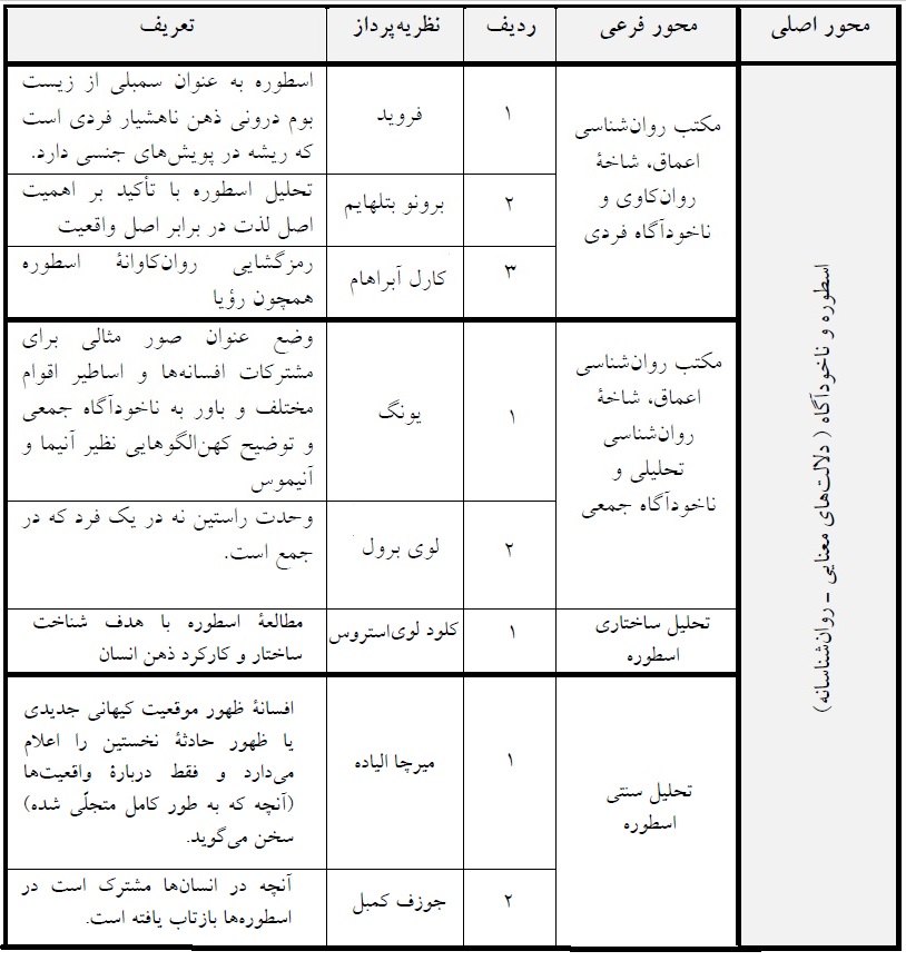 به طور کلی از دیدگاه یونگی اسطوره همان صور مثالی است و منظور از آن صورتهایی است که ماهیت دسته جمعی دارند و تقریباً در همه جای دنیا به شکل اجزای ترکیبدهندة افسانه ها و در عین حال به شکل پدیده های محلی و فردی و ناشی از ضمیر ناخودآگاه ظاهر میشوند و احتمالاً ناشی از استعدادهای روح بشر هستند. و از نظر دیدگاه فرویدی اسطوره به عنوان رؤیای بشریت و نتیجه یادهای فراموش شده و تمایلات سرکوب شده است.